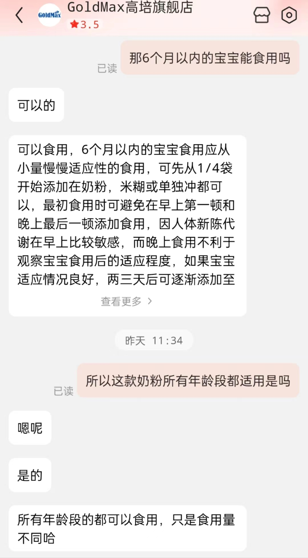 另外,客服对大公快消明确指出,6个月以内的宝宝是可以食用高培牛初乳粉。客服表示:“6个月以内的宝宝食用应从小量慢慢适应性的食用,可先从1/4袋开始添加在奶粉,米糊或单独冲都可以,最初食用时可避免在早上第一顿和晚上最后一顿添加食用,因人体新陈代谢在早上比较敏感,而晚上食用不利于观察宝宝食用后的适应程度,如果宝宝适应情况良好,两三天后可逐渐添加至标准量,提前为宝宝今后的体质打下基础,从而提高抗病能力。”