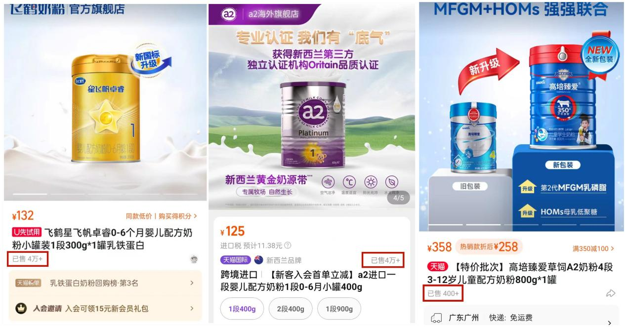 大公快消在高培天猫旗舰店中注意到,该店销量最高的为高培臻爱草饲A2奶粉4段,已售达400件。值得注意的是,同为天猫官方旗舰店中,像飞鹤星飞帆卓睿1段、a2奶粉1段的已售均达到40000件。相比之下,高培臻爱草饲A2奶粉4段的销量仅为飞鹤星飞帆1段、a2奶粉1段销量的1%。