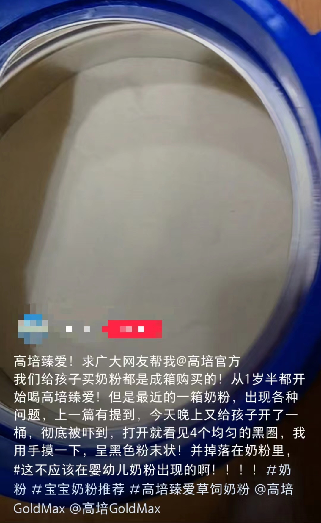 对此,有网友回应称,在购买的高培臻爱奶粉中也发现类似情况。该网友表示:“我也是买了一箱小罐装的,吃到快一半左右发现里面有好多黑点点,打开一罐新的又看见有一片灰色的絮状物。”
