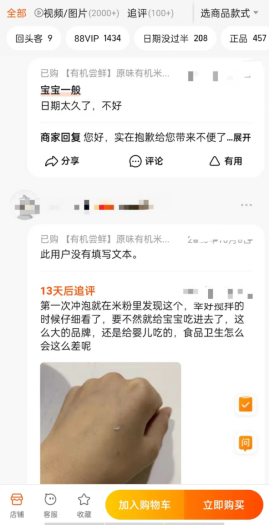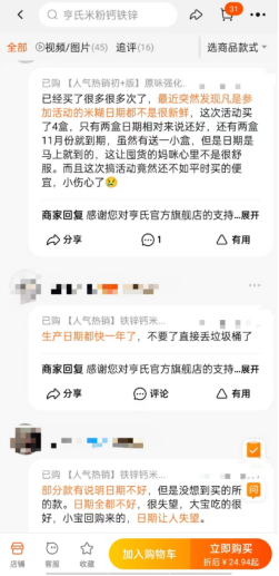除此之外,大公快消注意到,在淘宝亨氏官方旗舰店中,也有消费者在购买产品后注意到生产日期并不新鲜,有些保质期18个月的产品甚至已经过去一年多。