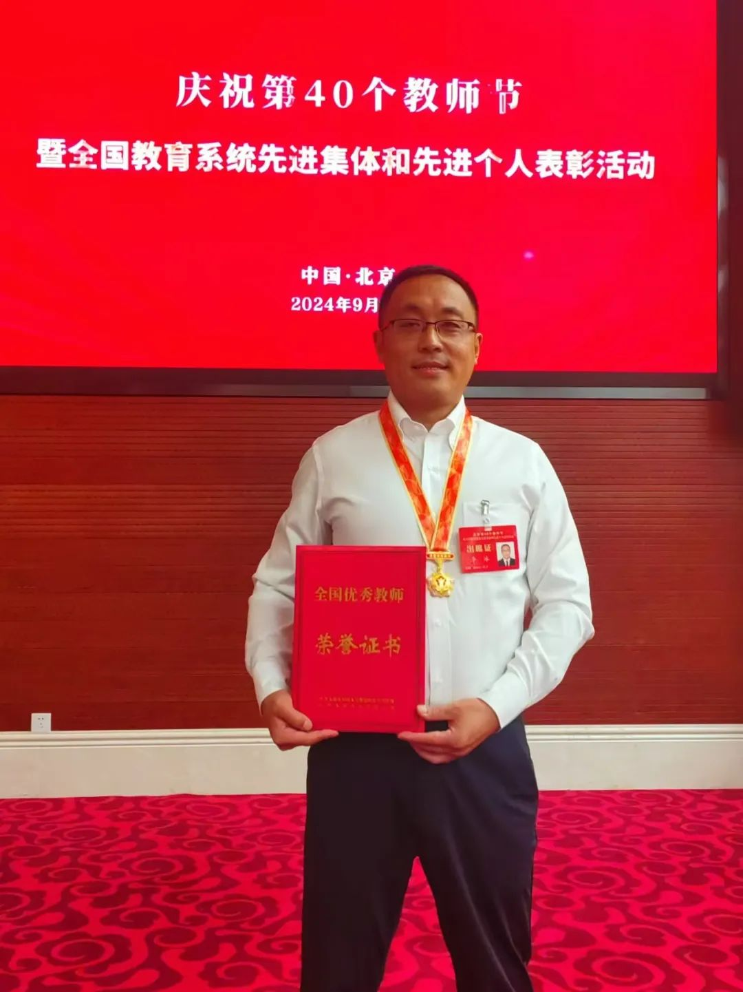 图:今年9月李冰获得全国优秀教师荣誉