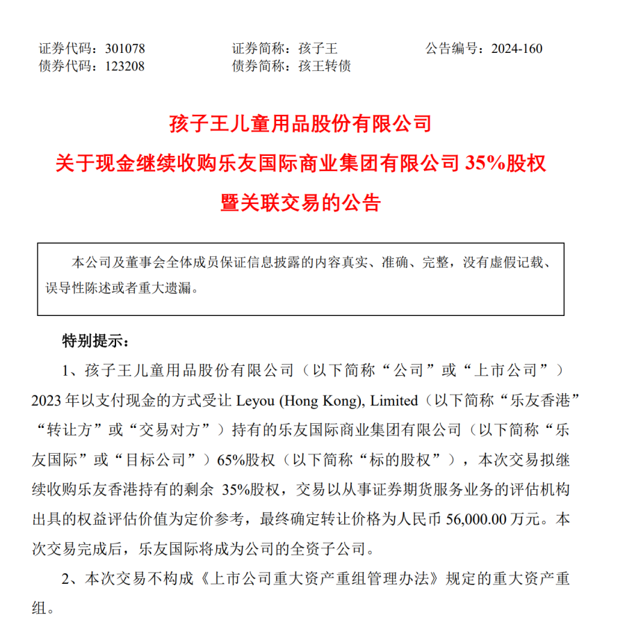 公告显示,孩子王2023年以支付现金的方式受让Leyou(HongKong),Limited持有的乐友65%股权,本次交易拟继续收购乐友香港持有的剩余35%股权,最终确定转让价格为人民币5.6亿元。本次交易完成后,乐友国际将成为公司的全资子公司。