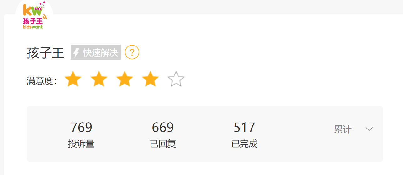 此外,孩子王被投诉的次数也并不算少。据黑猫投诉平台显示,孩子王累计投诉量为769条,已回复量为669条,已完成量仅为517条,完成率不足七成。
