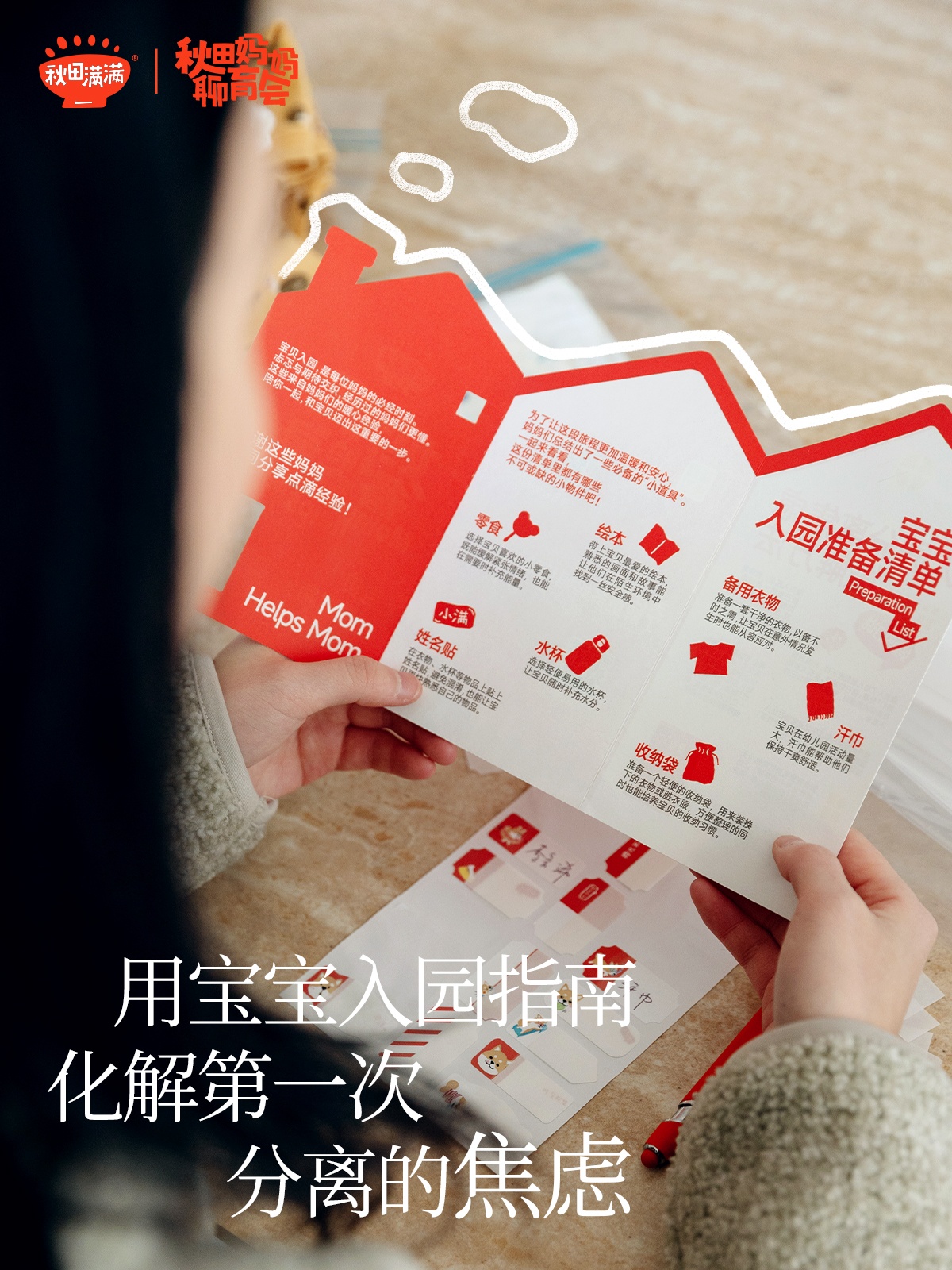 最后,秋田满满为妈妈和宝宝准备了一份入园包,希望帮助妈妈更充分地做好入园准备,安抚妈妈的焦虑情绪。除了给宝宝准备的书包和小零食,入园包里还有一份给妈妈的入园手册。手册不仅涵盖了宝宝入园必备的日常物品清单,还有一些过来人妈妈的入园分离焦虑缓解经验,意在让妈妈帮助妈妈。
