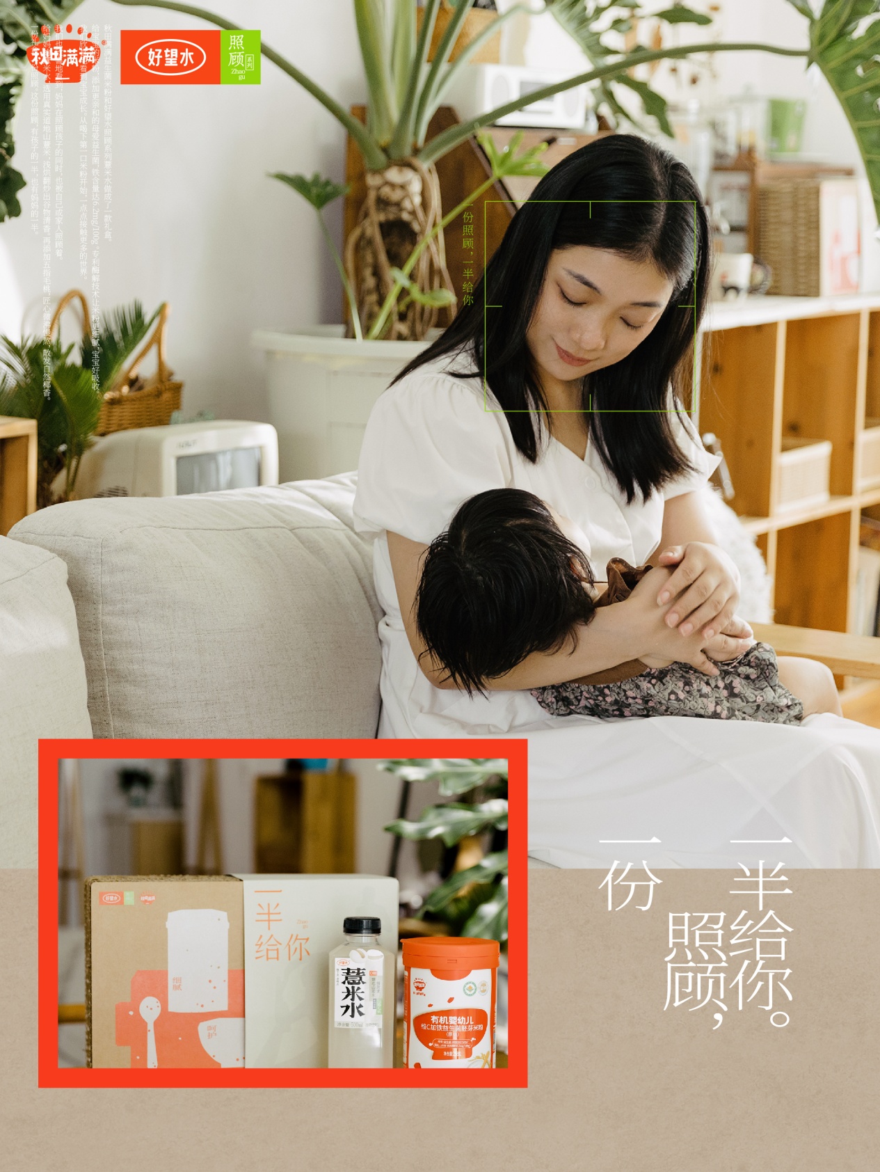 无独有偶,同年9月,秋田满满策划了“一份照顾,一半给你”的主题活动,此灵感也来源于社会洞察,秋田满满关注到,当家庭里增加了宝宝这个新成员,所有家庭成员的注意力都不可避免地转移到宝宝身上,从而忽视对妈妈的照顾和关怀,包括妈妈自己。但秋田满满仍然希望,每个新手妈妈在陪伴孩子成长的路上,也照顾好自己。