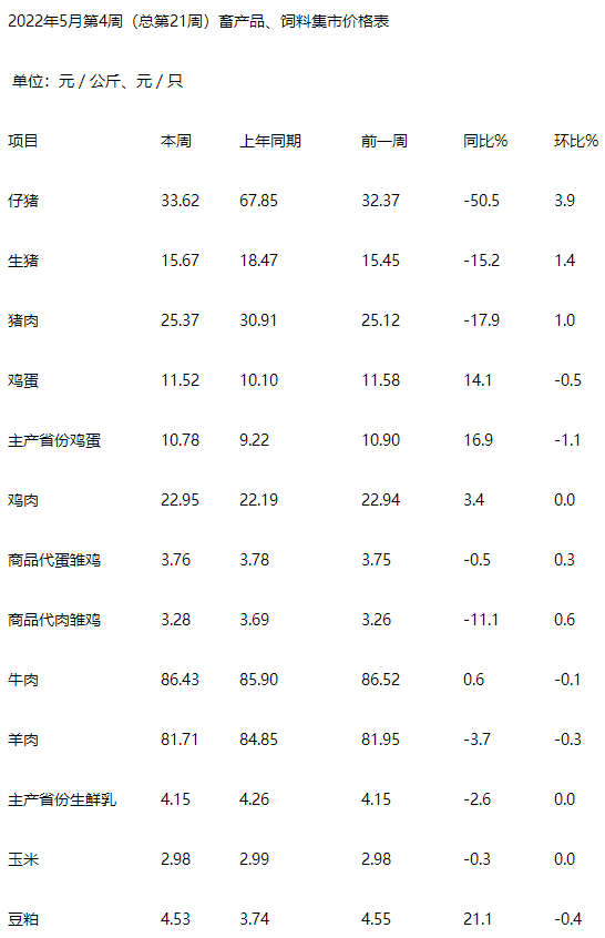 5月份第4周(采集日为5月25日)生猪产品、商品代蛋雏鸡、商品代肉雏鸡价格上涨,鸡蛋、牛羊肉、豆粕、蛋鸡配合饲料价格下降,鸡肉、生鲜乳、玉米、育肥猪配合饲料、肉鸡配合饲料价格持平。