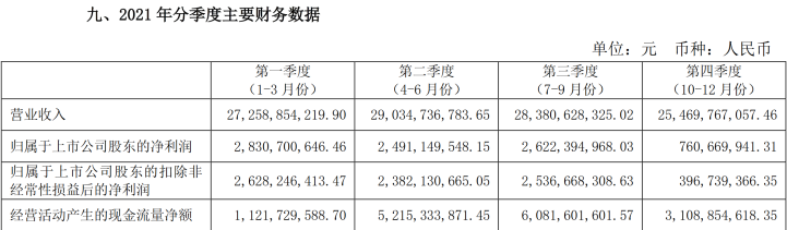 比如2021年第四季度,伊利股份归属于上市公司股东的净利润接近7.61亿元,与2020年同期10.54亿元相比,降幅在28%左右;归属于上市公司股东的扣除非经常性损益的净利润约为3.97亿元,和2020年第四季度8.18亿元相比,降幅在51%以上。