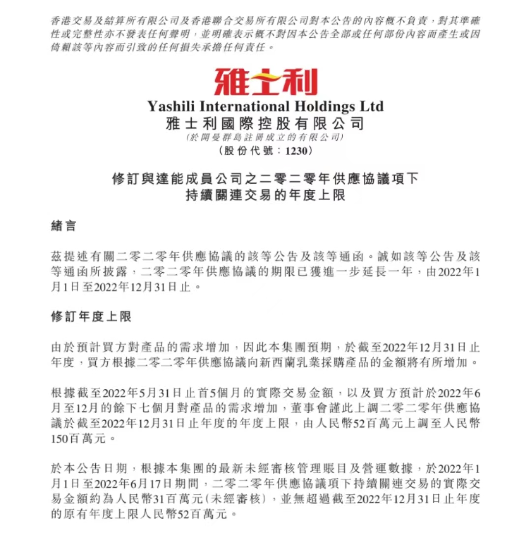 大公快消讯 6月17日,雅士利国际(以下简称“雅士利”)发布修订与达能成员公司之2020年供应协议项下持续关连交易的年度上限公告。