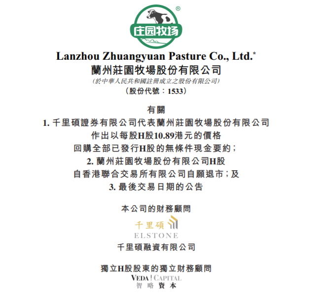 大公快消讯 8月4日,庄园牧场发布公告称,千里硕证券有限公司代表兰州庄园牧场股份有限公司作出以每股H股10.89港元的价格,回购全部已发行H股的无条件现金要约。