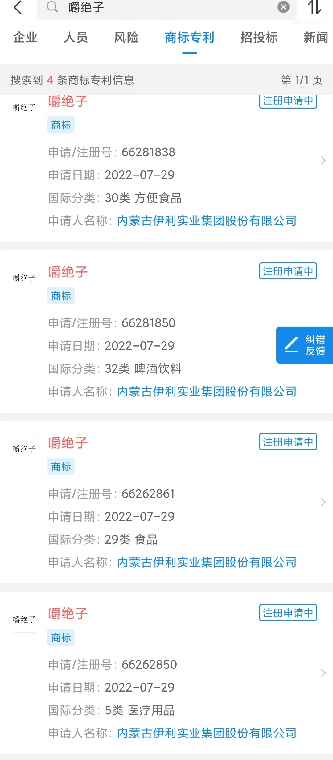 大公快消讯 据企查查App显示,近日,内蒙古伊利实业集团股份有限公司(以下简称“伊利股份”)申请注册多枚“嚼绝子”商标。