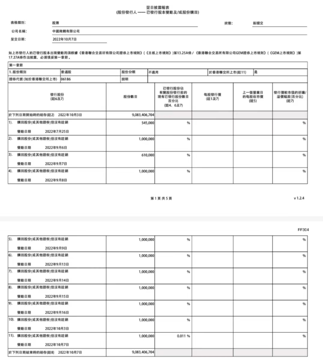 公告称,公司于2022年10月7日在香港交易所回购100.00万股,耗资531.15万港币,根据此次回购数量和耗资情况计算回购均价约为5.31港币;根据披露此次最高回购价5.30港币,最低回购价5.30港币。
