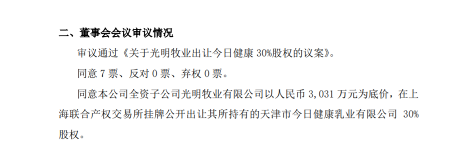 据悉,光明乳业全资子公司光明牧业有限公司以3031万元为底价,在上海联合产权交易所挂牌公开出让其所持有的天津市今日健康乳业有限公司30%股权。