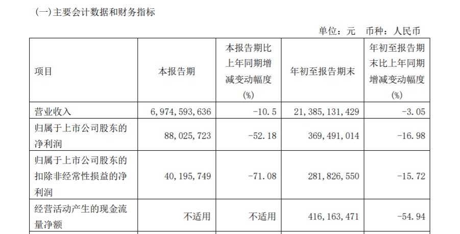 据悉,前三季度公司营收为213.85亿元,同比下降3.05%;净利润约为3.69亿元,同比下降16.98%。单第三季度公司营收约为69.75亿元,同比下降10.5%;净利润约为8802.57万元,同比下降52.18%。