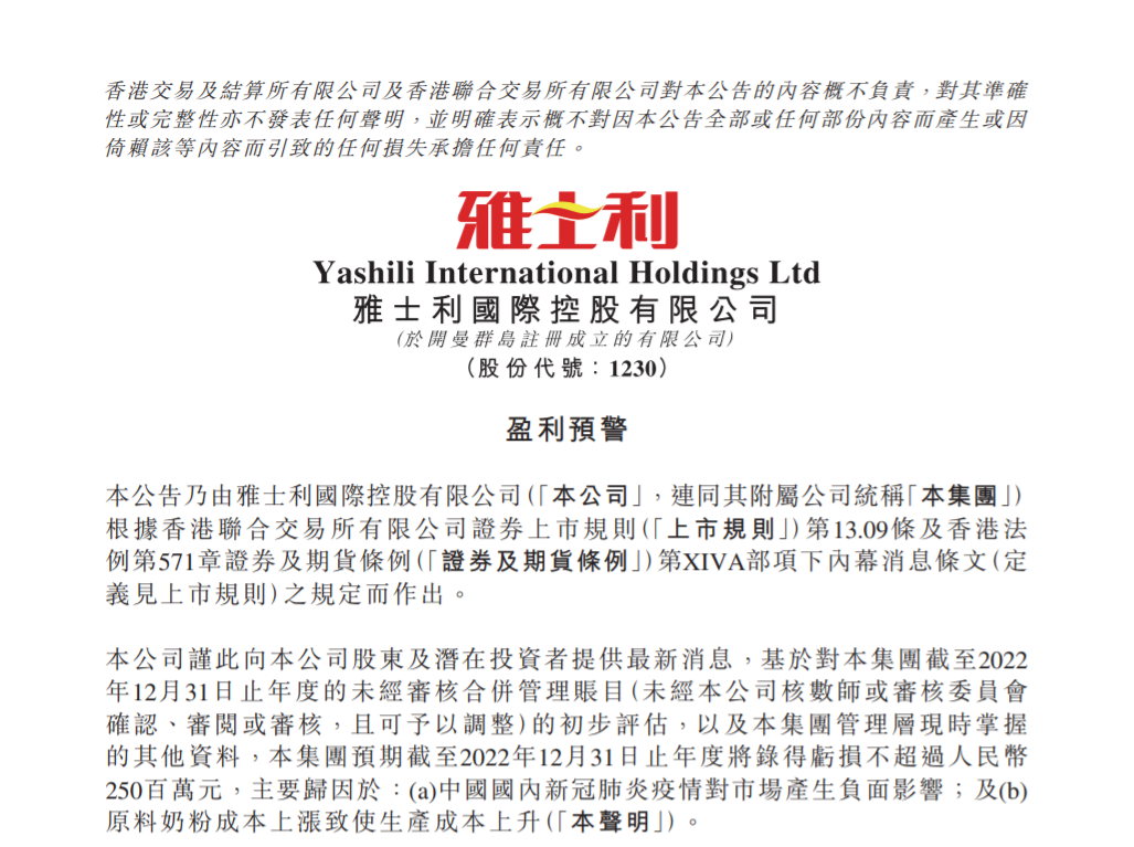 对此,雅士利国际方面认为,主要归因于疫情对市场产生负面影响以及原料奶粉成本上涨致使生产成本上升。