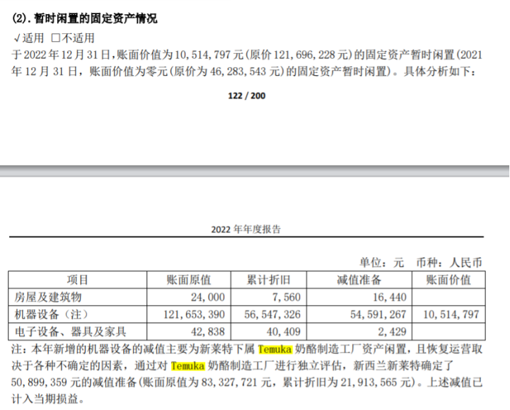 光明乳业在财报中提到,2022年新增的机器设备的减值主要为新莱特下属Temuka奶酪制造工厂资产闲置,且恢复运营取决于各种不确定的因素,通过对Temuka奶酪制造工厂进行独立评估,新莱特确定了5089.94万元的减值准备。