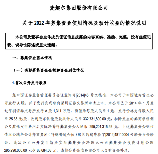 大公快消讯 5月9日,麦趣尔发布关于2022年募集资金使用情况及预计收益的情况说明。
