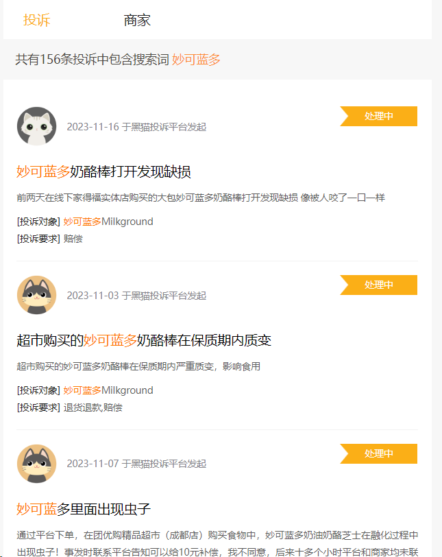 在妙可蓝多还未扭转亏损现状的时候,其产品却多次因食安问题被消费者投诉。通过黑猫投诉可以看到,截至11月22日,妙可蓝多共有百余条投诉,其中被投诉频率最高的产品就是奶酪棒,投诉理由包括奶酪棒中有褐色不明物质、头发等,还有产品在保质期内出现变质、有异味、发霉等情况。