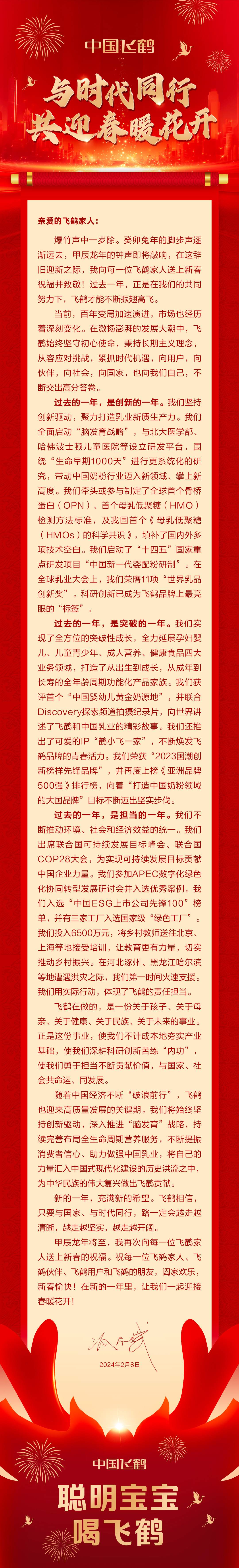 甲辰龙年将至,我再次向每一位飞鹤家人送上新春的祝福。祝每一位飞鹤家人、飞鹤伙伴、飞鹤用户和飞鹤的朋友,阖家欢乐,新春愉快!在新的一年里,让我们一起迎接春暖花开!
