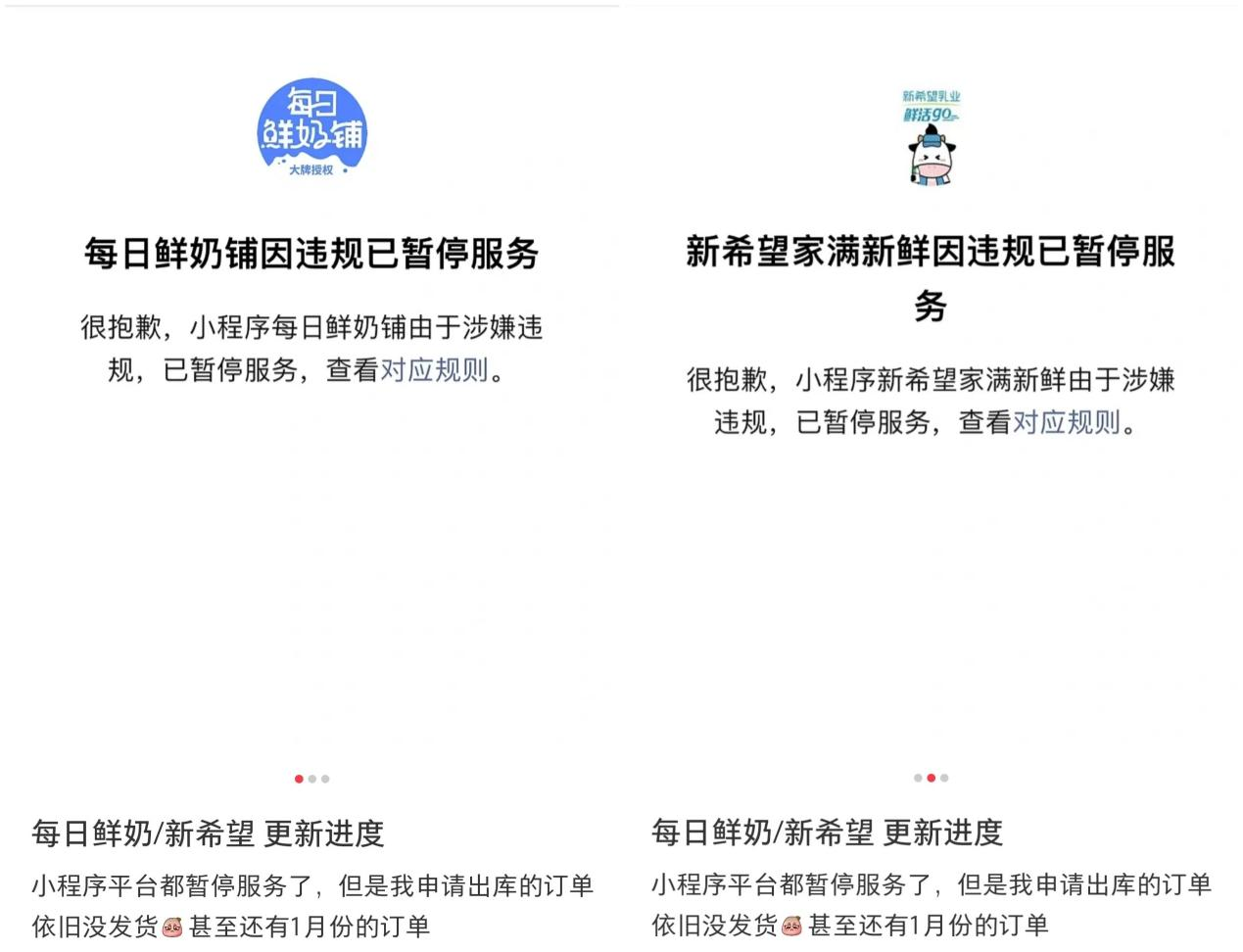 值得注意的是,无论是“鲜奶随心Go”还是“每日鲜奶铺”,在小程序上均已无法搜到。对于无法搜到的原因,据网友在小红书发布的图片显示,“每日鲜奶铺”和“新希望家满新鲜”小程序因违规已暂停服务。