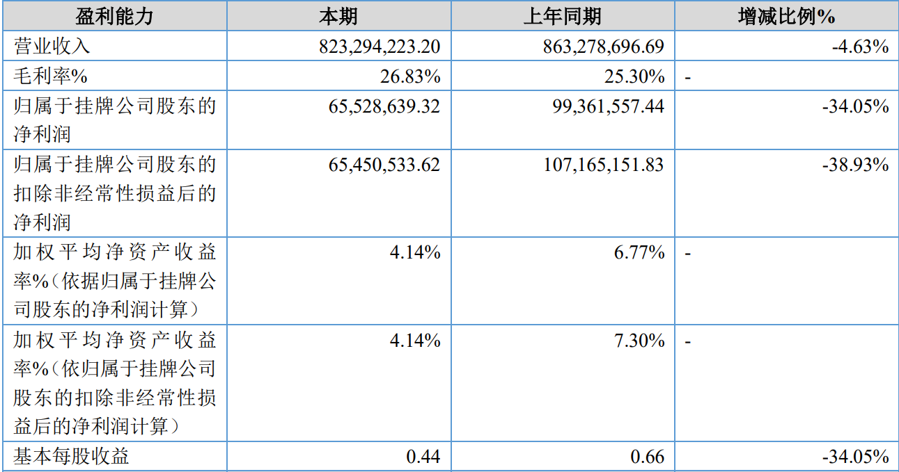 报告期内,南方乳业营业收入约为8.23亿元,同比下滑4.63%;归属于挂牌公司股东的净利润接近6553万元,同比下滑34%左右;归属于挂牌公司股东的扣除非经常性损益后的净利润约为6545万元,同比下滑38%左右。