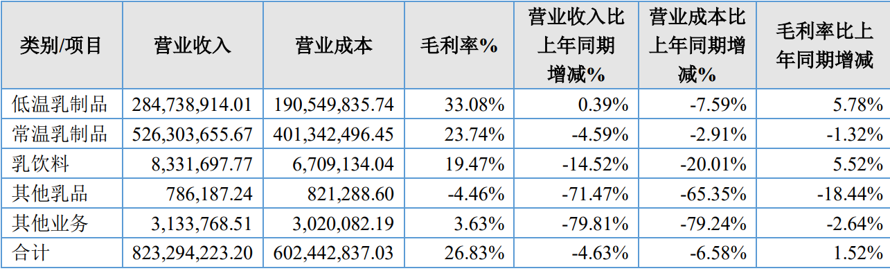 财报显示,今年上半年低温乳制品、常温乳制品、乳饮料、其他乳品、其他业务的毛利率分别同比增长5%、下滑1%、增长5%、下滑18%、下滑2%左右。