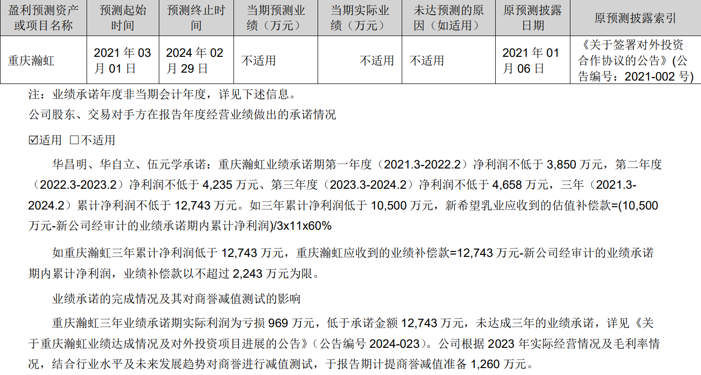 据悉,此次新乳业遭到警示函主要源于新乳业曾在今年4月发布的2023年年度报告。新乳业在报告中表示:“重庆瀚虹三年业绩承诺期实际利润为亏损969万元,低于承诺金额12743万元,未达成三年的业绩承诺,公司根据2023年实际经营情况及毛利率情况,结合行业水平及未来发展趋势对商誉进行减值测试,于报告期计提商誉减值准备1260万元。”