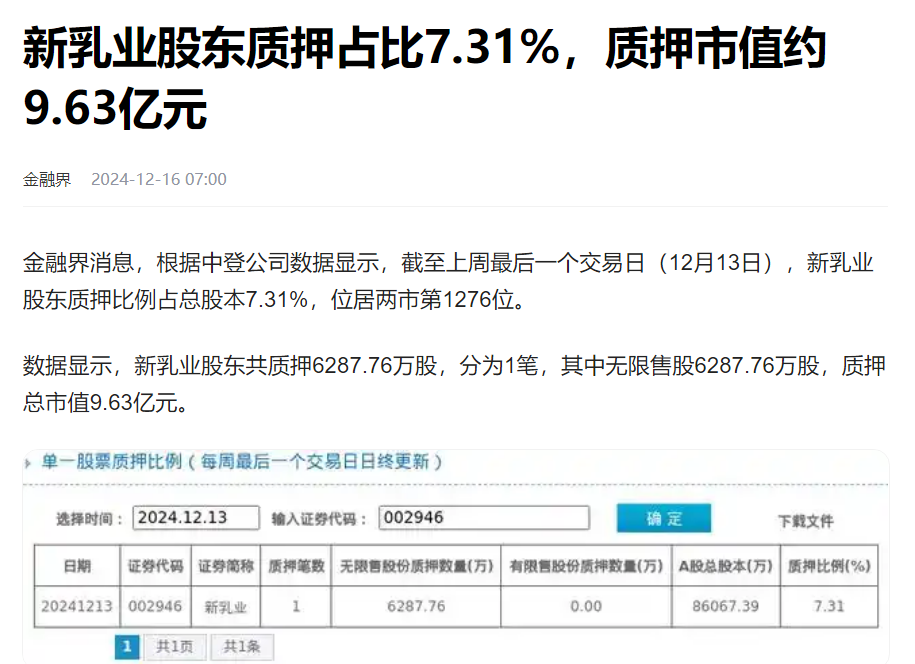 据金融界等媒体报道显示,截至12月13日,新乳业股东质押比例占总股本7.31%,新乳业股东共质押6287万股左右,质押总市值超9亿元。