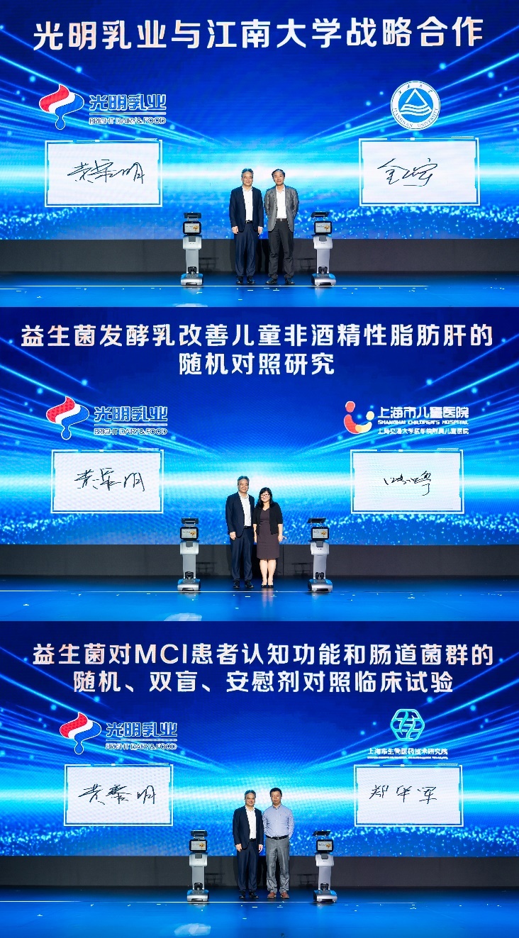 同时,光明乳业分别与上海市儿童医院消化感染科主任张婷、上海市生物医药技术研究院郑华军研究员签署了项目合作协议,未来将共同开展“益生菌发酵乳改善儿童非酒精性脂肪肝的随机对照”研究、“益生菌对MCI患者认知功能和肠道菌群的随机、双盲、安慰剂对照”临床试验等,深化产学研融合,破解行业难题,也为市场提供更多新品。