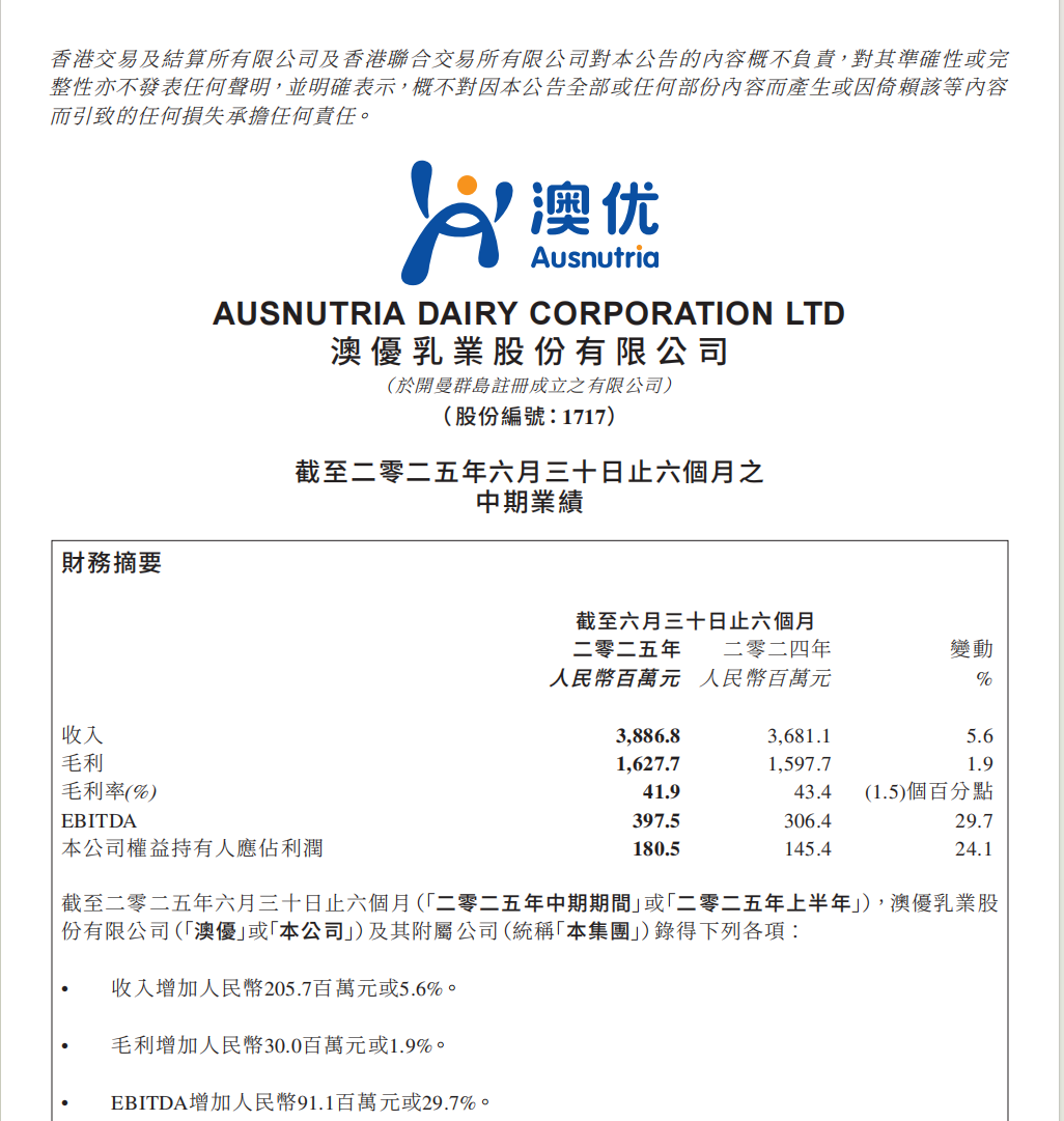 8月27日,澳优乳业股份有限公司(股份代号:1717.HK,简称“澳优”)发布2025年上半年业绩公告。公告显示:2025年1-6月,澳优实现营业收入约人民币38.87亿元,同比增长5.6%;EBITDA(息税折旧及摊销前利润)约人民币3.98亿元,同比增长29.7%;归属于母公司权益持有人应占利润约人民币1.81亿元,同比增长24.1%,实现营收利润持续韧性双增长。