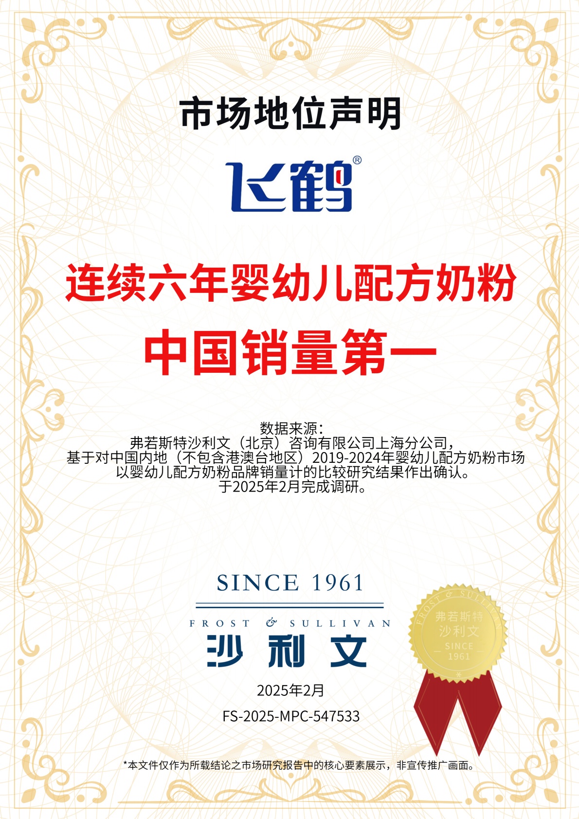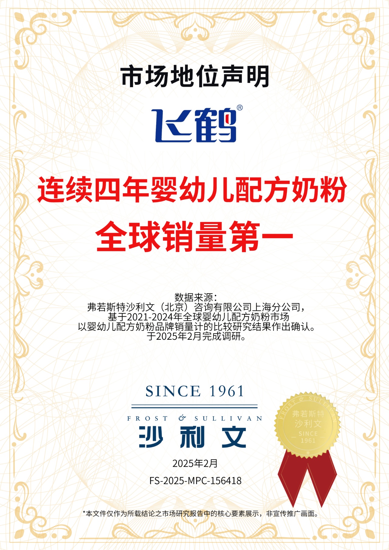 2025年上半年,飞鹤婴配粉全渠道市场份额及销量继续稳居市场第一。基于2021年至2024年全球婴配粉市场以及婴配粉品牌销量的比较研究结果做出确认,飞鹤连续四年婴幼儿配方奶粉全球销量第一。