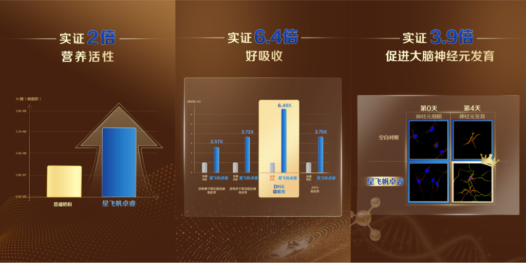 目前,飞鹤的科技投入已转化为实实在在的产品优势。在近日由中国食品科学技术学会主办的研讨会上,飞鹤分享了“新一代鲜活营养”的研发与产业实践成果。其明星产品星飞帆卓睿奶粉获得多项科学实证支持,数据显示其活性营养成分(N糖)达到普通奶粉的2倍,DHA吸收率提升至普通奶粉的6.4倍,关键营养素吸收效率显著领先。