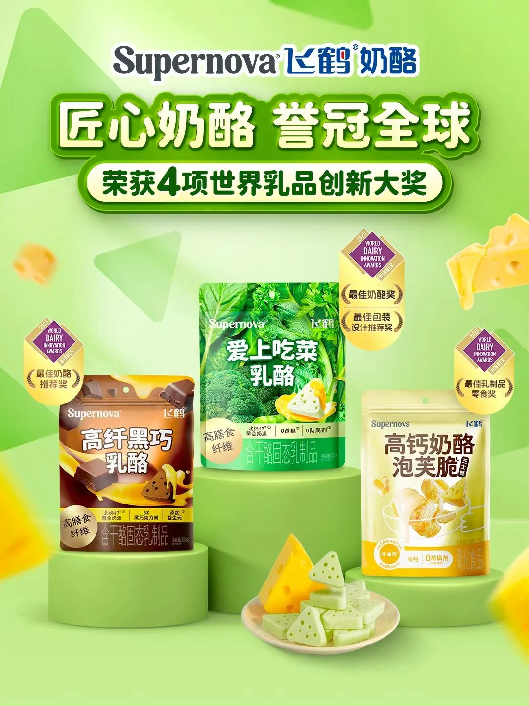 在儿童青少年领域,Supernova飞鹤奶酪也取得行业权威肯定。Supernova飞鹤奶酪三款产品获得被誉为“乳品创新奥斯卡”的2025年世界乳品创新奖,其中“爱上吃菜奶酪”和“高钙奶酪泡芙脆(芝士味)”两款创新产品斩获“最佳奶酪”和“最佳乳制品零食”双料大奖,“爱上吃菜奶酪”和“高纤黑巧乳酪”获得“最佳包装设计推荐奖”和“最佳奶酪推荐奖”。这标志着飞鹤在儿童及青少年营养乳品细分领域的创新实力与卓越品质获得全球消费市场及行业的高度认可,也标志着飞鹤在全生命周期功能营养的布局取得显著成效。