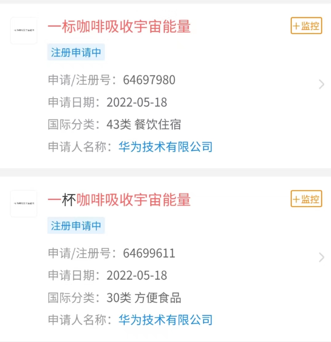 大公快消讯 据企查查消息,近期,华为技术有限公司申请注册“一标咖啡吸收宇宙能量”“一杯咖啡吸收宇宙能量”商标,国际分类分别为第43类-餐饮住宿、第30类-方便食品,目前商标状态均为正在注册申请中。