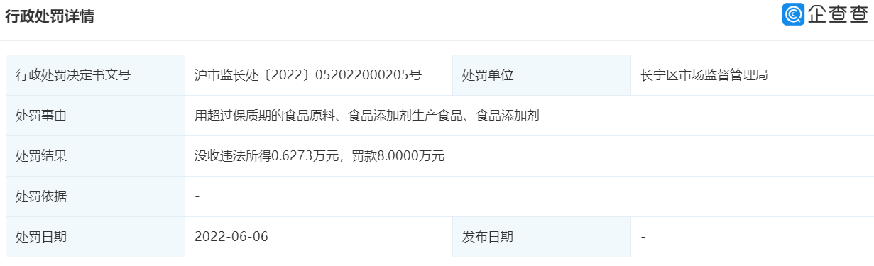 大公快消讯 企查查信息显示,6月6日,老乡鸡(上海)餐饮有限公司凯旋路店因用使用过期炼制鸡油,被长宁区市场监督管理局没收违法所得6273元、罚款8万元。