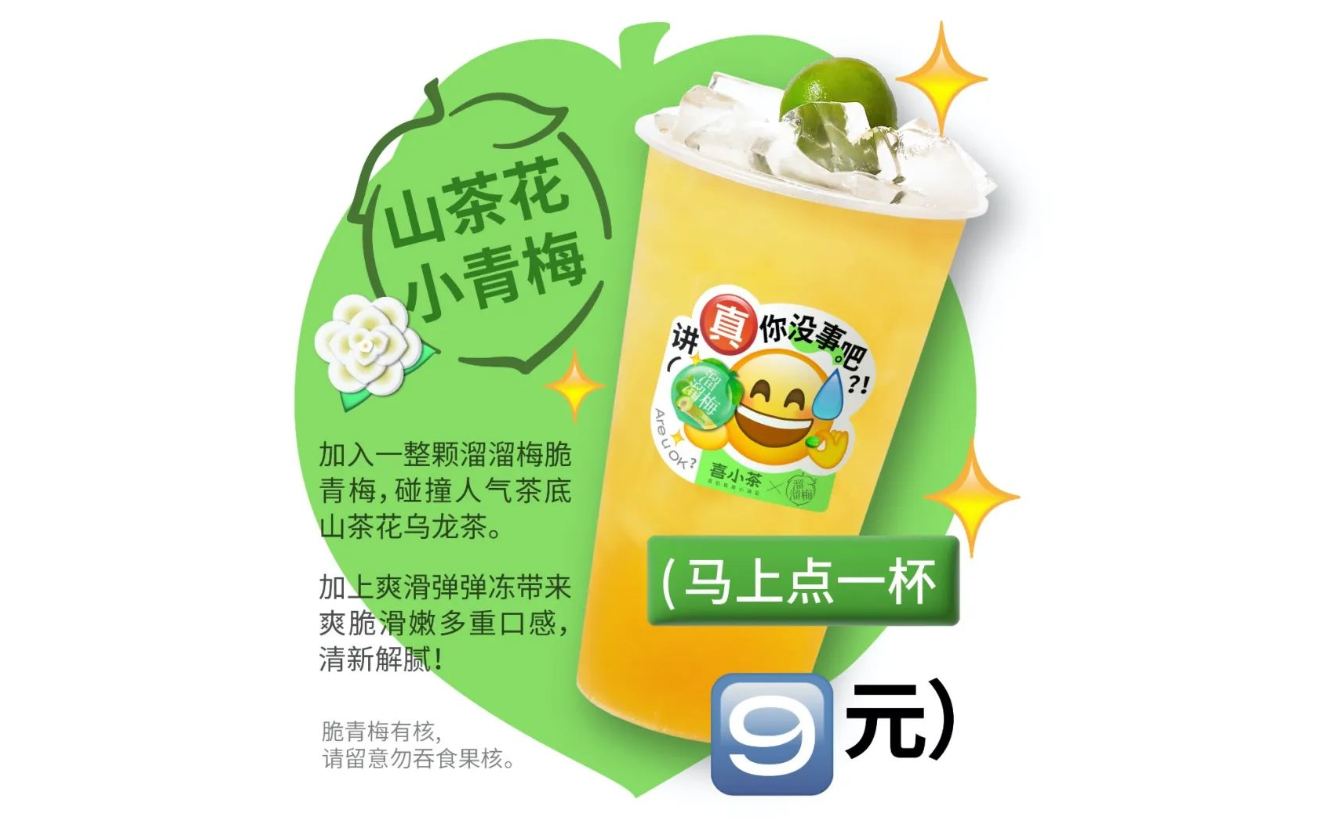 在宣传方面,据“喜小茶”介绍,新品售价9元,并且在联名期间,限定使用溜溜梅脆青梅。此外,还有联名款“真无语小发卡”等周边同步推出。