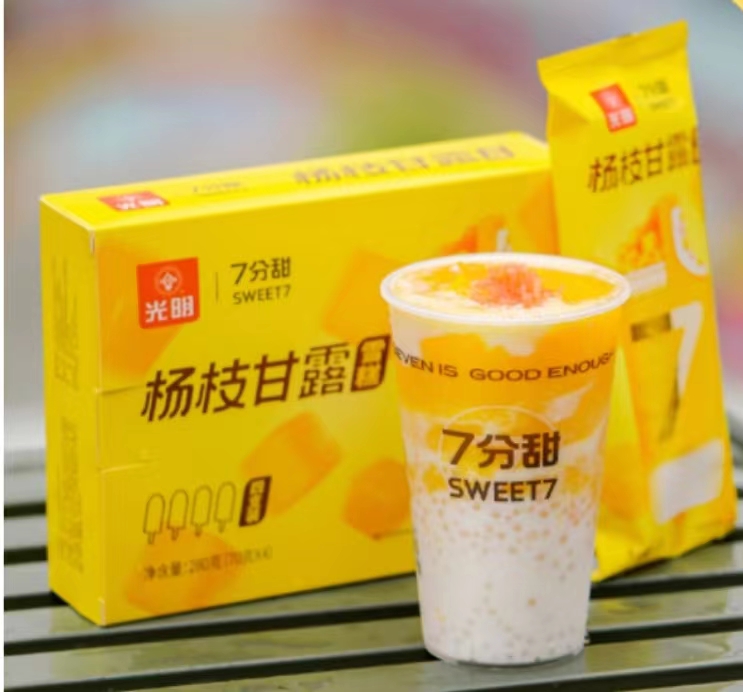 据官方表示,作为“杯装杨枝甘露首创者”7分甜,此次携手“国潮老字号”光明冷饮开启 “万物皆可杨枝甘露 ”新玩法。官网介绍,杨枝甘露雪糕选用光明高品质生牛乳,搭配芒果口味冰壳、芒果果粒和西柚果冻,使得奶味与果味融合在一起,口感非常丰富。