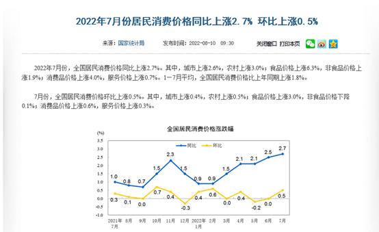 大公快消讯 8月10日,国家统计局今天发布了2022年7月份全国CPI(居民消费价格指数)。
