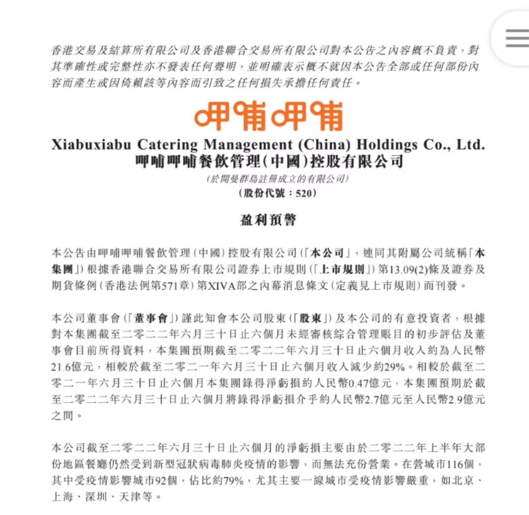 大公快消讯 近日,呷哺呷哺发布盈利预警公告,公告称,该公司上半年预计亏损2.7亿元至2.9亿元。