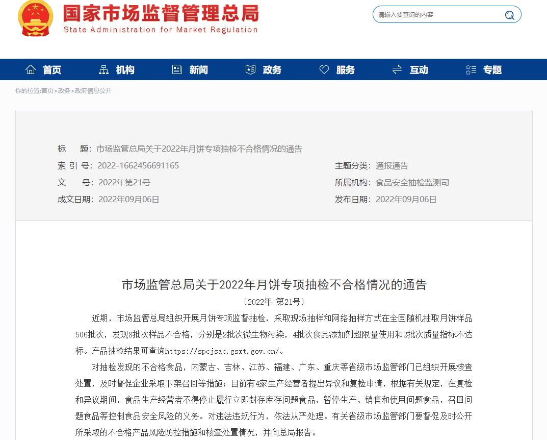 大公快消讯 9月6日,市场监管总局发布2022年月饼专项抽检不合格情况。通报显示,市场监督管理总局在全国随机抽取月饼样品506批次,发现8批次样品不合格。其中有2批次微生物污染、4批次食品添加剂超限量使用以及2批次质量指标不达标。
