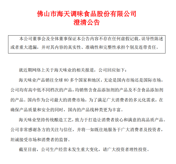 此外,海天味业还称,公司坚持传统酿造工艺,致力于打造让消费者放心和满意的高品质产品。公司非常感谢各方的关注与信任,并将一如既往地服务于广大消费者及投资者,坦诚接受市场和消费者的监督。截至目前,公司生产经营未发生重大变化,请广大投资者理性投资。