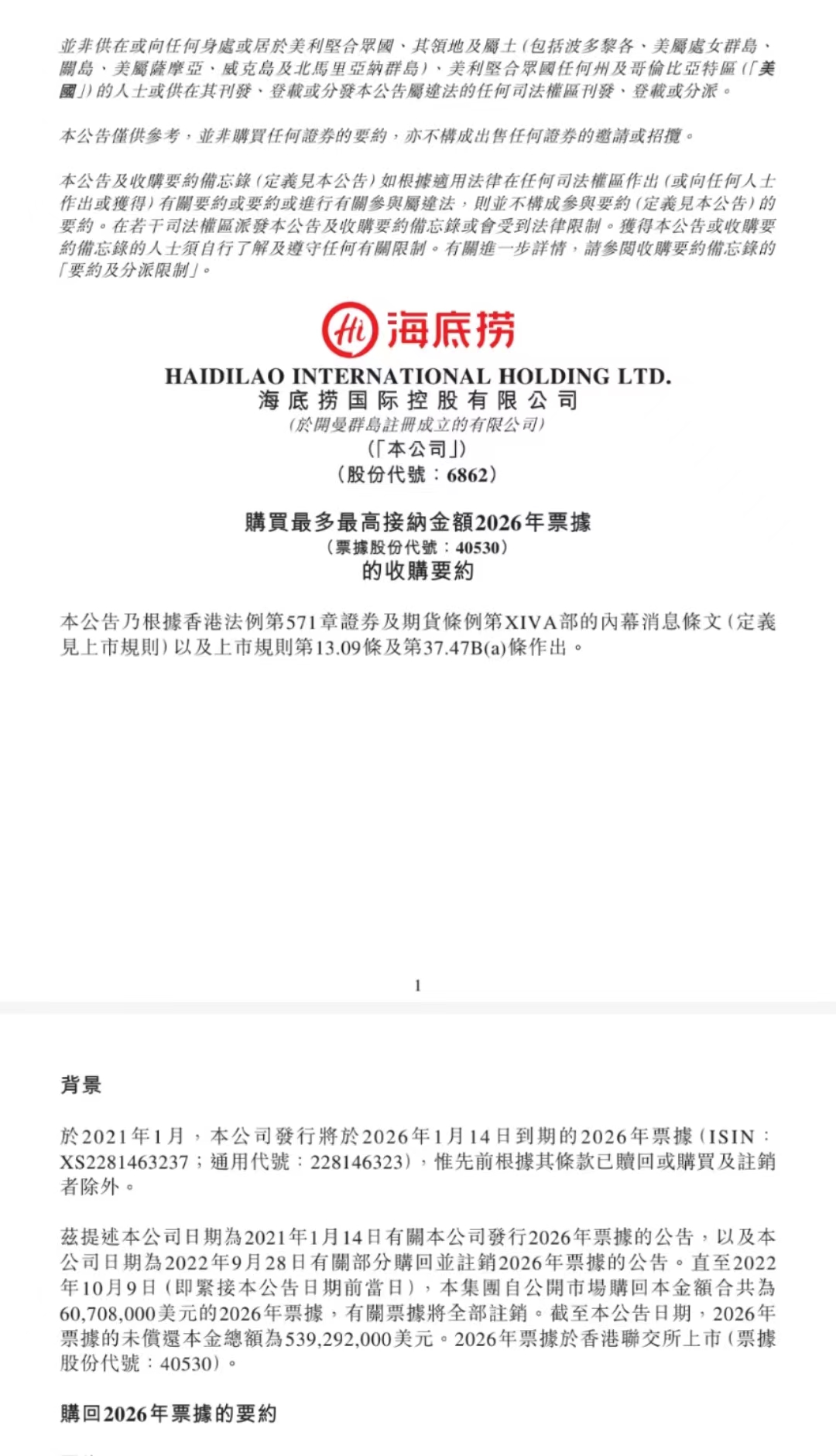 公告显示,在本次回购计划启动前,即至2022年10月9日,海底捞已从公开市场购回本金额合共为6071万美元的2026年票据,有关票据将全部注销。截至公告日,2026年票据的未偿还本金总额为5.39亿美元。