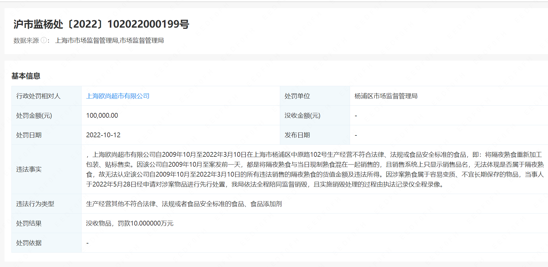 大公快消讯 企查查App显示,近日,上海欧尚超市有限公司因生产经营其他不符合法律、法规或者食品安全标准的食品,被杨浦区市监局罚款10万元,并没收物品。处罚日期为2022年10月12日。