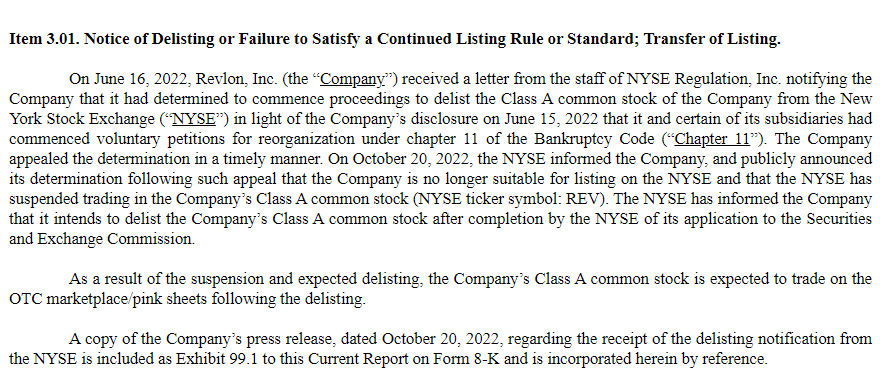 公告显示,露华浓于2022年6月16日被通知,鉴于露华浓自愿提出重组申请,因此已决定启动程序,将公司的A类普通股从纽约证券交易所除名。公司及时对这一决定提出上诉。2022年10月20日,纽约证券交易所通知公司,并在上诉后公开宣布其决定,即公司不再适合在纽约证券交易所上市。
