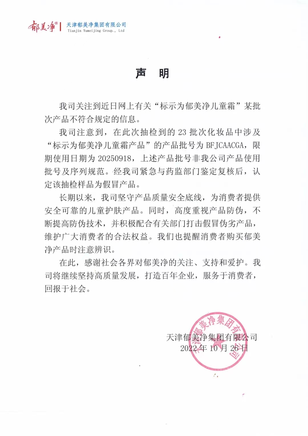 声明指出,郁美净公司关注到近日网上有关“标示为郁美净儿童霜”某批次产品不符合规定的信息。公司注意到,在此次抽检到的23批次化妆品中涉及“标示为郁美净儿童霜产品”的产品批号为BFJCAACGA,限期使用日期为20250918,上述产品批号非郁美净公司产品使用批号及序列规范。经公司紧急与药监部门鉴定复核后,认定该抽检样品为假冒产品。