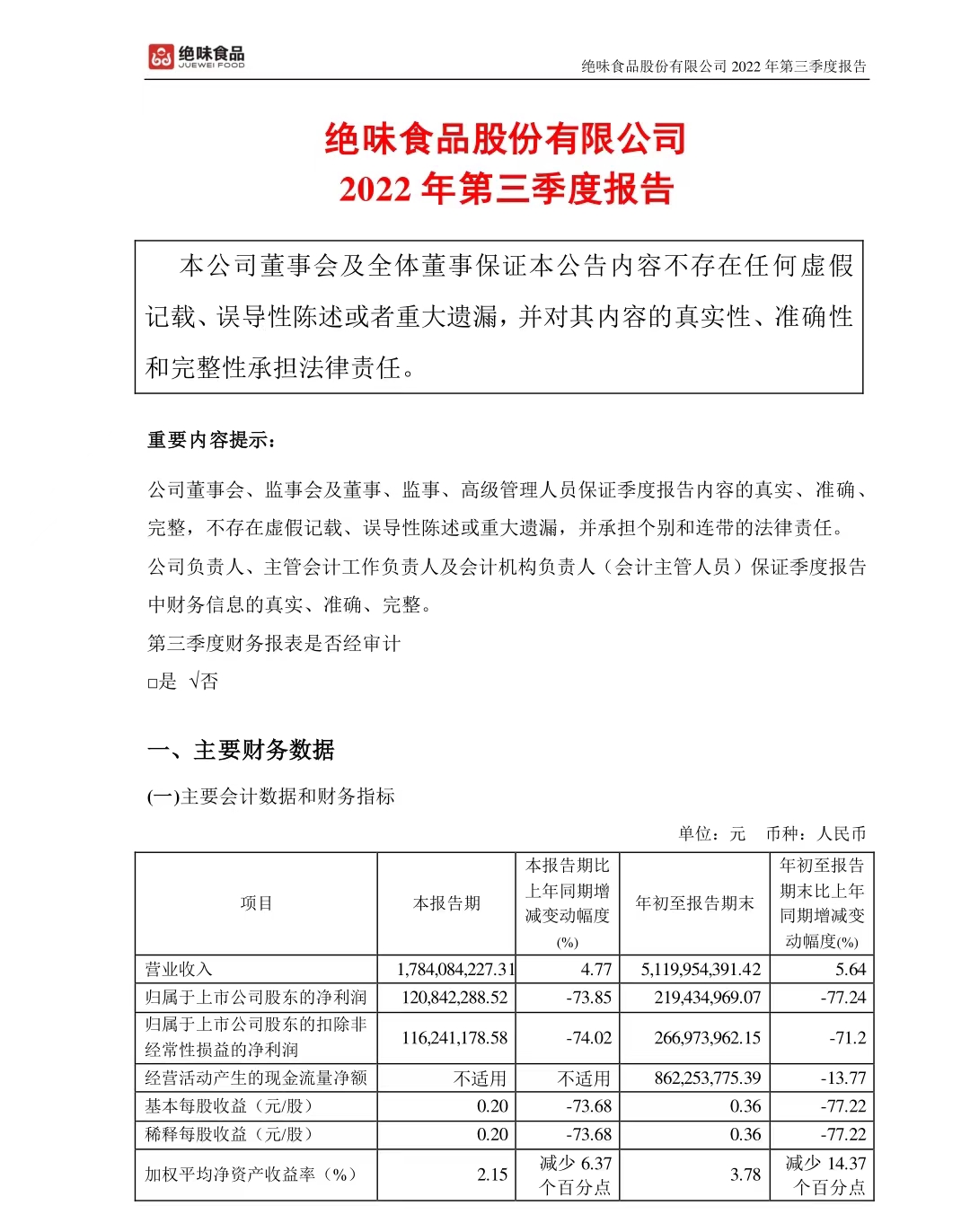 大公快消讯 10月26日晚间,绝味食品披露2022年前三季度报告。