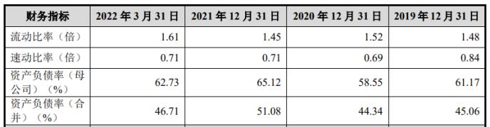 从招股书可得,2019年至2022年,八马茶业的资产负债率(合并)处于逐年攀升的状态,分别为45.06%、44.34%、51.08%、46.71%,其中母公司资产负债率更是常年处于60%上下。