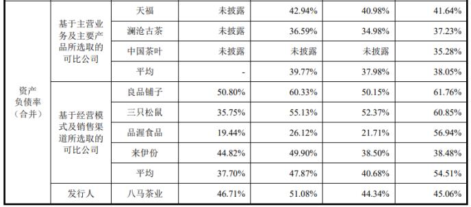而与同行业茶企相比,数据显示,八马茶业的资产负债率也明显高于澜沧古茶和中国茶叶,与天福较为接近。并且,八马茶业的资产负债率(合并)也显著高于这类以茶业为主营业务的企业资产负债率(合并)的平均值。