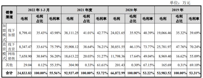 数据显示,从2019年到2022年,八马茶业加盟模式下的销售收入分别为4.80亿元、5.95亿元、8.91亿元和2亿元,占主营业务收入的比例分别为47.44%、47.33%、51.50%和44.76%。同期,该模式下的毛利率分别为39.69%、40.39%、42.77%和43.98%。