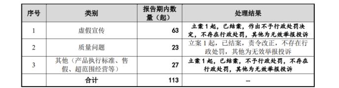 数据显示,从2018至2021年,八马茶业共设涉及113起投诉、举报事件。其中,虚假宣传有63起,质量问题有23起,其他(产品执行标准、售假、超范围经营等)则有27起。