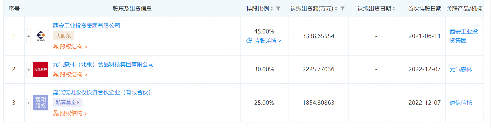 大公快消讯 近日,企查查平台显示,西安太阳食品有限责任公司发生工商变更,新增股东元气森林(北京)食品科技集团有限公司、嘉兴宸玥股权投资合伙企业(有限合伙)(投资机构为建信信托,下文简称“嘉兴宸玥”),持股比例分别为30%、25.00%,同时公司的注册资本增加至7419.23万元。